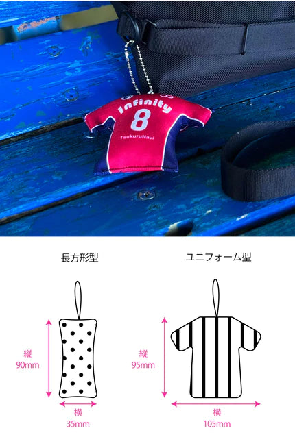 完成サイズ | 長方形型: 縦90mm×横35mm×厚さ25mm ユニフォーム型: 縦95mm×横105mm 中綿: ポリエステル |