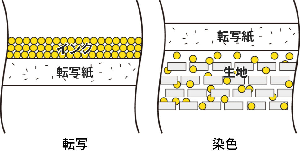 専用のインクをインクジェットプリンタで転写紙に印字し、その転写紙にプリントしたい生地を合わせて加熱することにより、気化したインクを化学繊維の分子構造にまで染め込んで染色する方法です。生地の温度はすぐに下がるため気化された分子構造に入りこんだインクは同じ高温、高圧をかけない限り色が落ちません。また、印刷と生地とが一体化するため、耐摩耗性が高く塗膜などの厚みが全くないのも特徴の1つです。